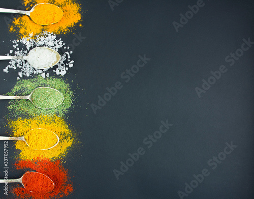 A variety of spices in spoons on a dark table. Cooking background. View from above. Ingredients for cooking. Table background menu. Copy space.