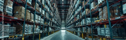 A vast distribution warehouse with towering shelves stacked high with goods, showcasing the immense scale and efficiency of modern logistics operations