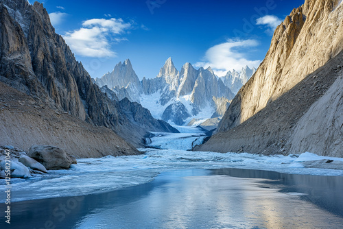 A vast glacial expanse nestled between towering icy peaks, the frozen surface reflecting the brilliant blue of the sky.