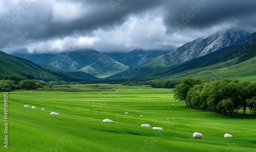 A vast grassland with green pastures, herds of sheep and cows grazing peacefully under the sky, distant mountains shrouded in dark clouds
