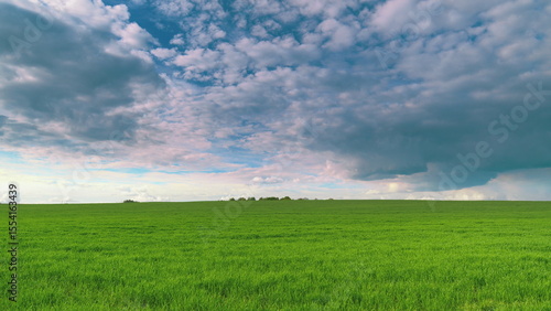 A Vast Green Field Stretching Beneath a Dramatic Cloudy Sky Awaits Your Discovery Time lapse.