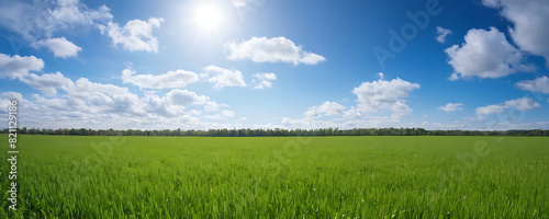 A vast, lush green field stretches towards the horizon under a bright blue sky dotted with fluffy white clouds