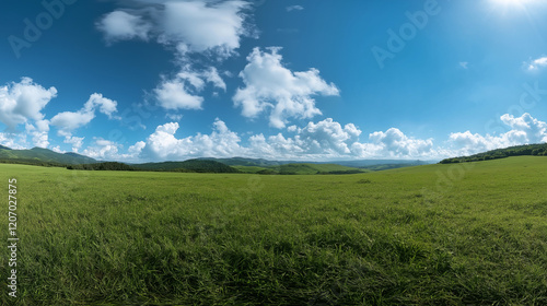 sky, grass, field, landscape, green, meadow, blue, nature, cloud, summer, cloud, horizon, spring, agriculture, sun, hill, land, rural, lawn, countryside, country, farm, environment, white, outdoors