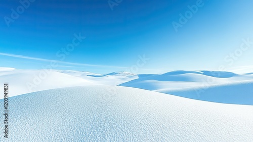 A vast winter snowfield with untouched white snow under a clear blue sky.