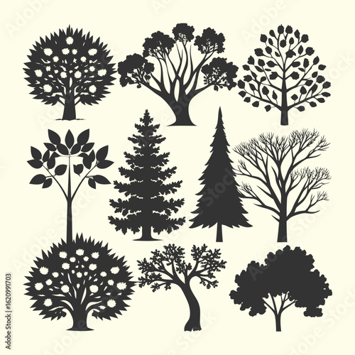 vector, illustration, tree, forest, silhouette, pattern, design, black, nature, pine, birch, oak, collection, graphic, decorative, set, isolated, background, texture, digital, art, abstract, tree branch, leaf, wood, ecology, environment, symbol, landscape, season, natural, organic, plant, wild, wilderness, jungle, timberland, park, flora, logotype, element, icon, drawing, creative, style, simple, modern, minimal
