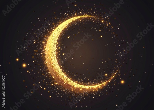 A vector illustration of an elegant golden crescent moon with glittering particles, centered on a solid background, perfect for Ramadan or Muslim culture themes.