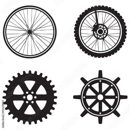 A vector set of transportation wheel icons featuring bicycle, car, and gear designs
