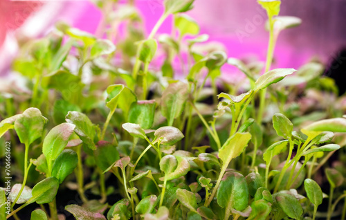A vegetable seedling grows in a greenhouse and is illuminated by a phytolamp.