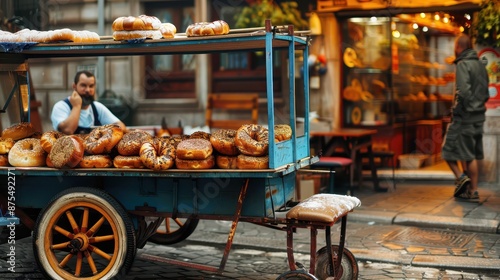 A vendor selling various types of bread from a blue wooden cart on a cobblestoned street in an urban area, highlighting daily street life and freshly baked goods.