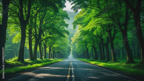A vertical image shows a deserted road surrounded by tall, green trees in a forest.