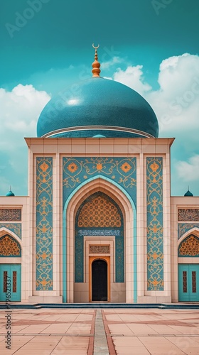 A Vertical Of A Mosque With A Blue Dome.