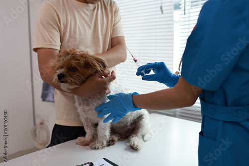 A veterinarian examines a sick puppy in a veterinary clinic, using a stethoscope to check its health and prescribe proper medication.