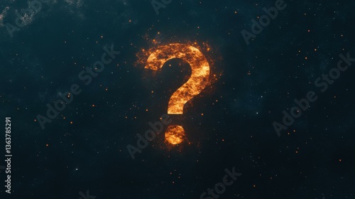 A vibrant 3D question mark hovers in a dark void, enveloped in swirling plasma, creating a cosmic enigma.