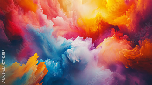 A vibrant abstract art piece featuring a swirling mass of colorful clouds. The image is dominated by shades of red, orange, yellow, blue, and purple