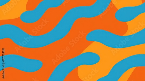 A vibrant abstract design featuring flowing blue and orange shapes against a bright background, creating a playful and dynamic visual effect.
