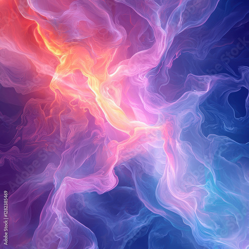 A vibrant, abstract digital artwork with flowing lines and shapes, blending warm pinks to cool blues, suggesting swirling smoke or cosmic phenomena in space Organic style implies a nat - AI-Generated