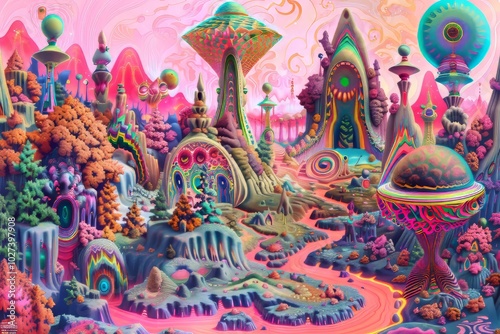 A vibrant alien landscape with colorful rock formations and whimsical structures under a pastel sky at twilight