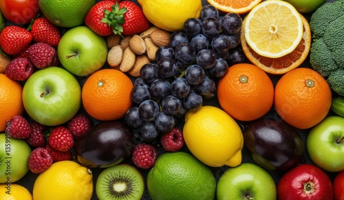 fruit, vegetable, healthy eating, nourishment, vitamin, antioxidant, fresh produce, colourful, assortment, variety, apple, orange, lime, strawberry, raspberry, grape, almond, broccoli, kiwi, plum, tomatoes, raw food, closeup, vibrant, health food