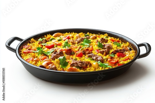 A vibrant and colorful chicken paella served in a traditional black pan, garnished with fresh cilantro.