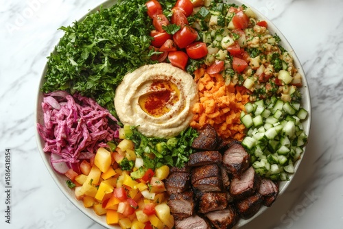 A vibrant and delicious Mediterranean-style platter featuring grilled meat, fresh salads, hummus, and a variety of colorful chopped vegetables.