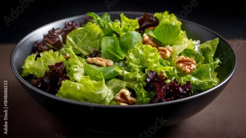 A vibrant and fresh salad featuring a mix of green and red lettuce leaves with crunchy walnuts presented in a dark bowl