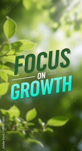 A vibrant and inspiring digital poster with the message 'Focus on Growth' set against a lush green background of leaves and sunlight filtering through trees