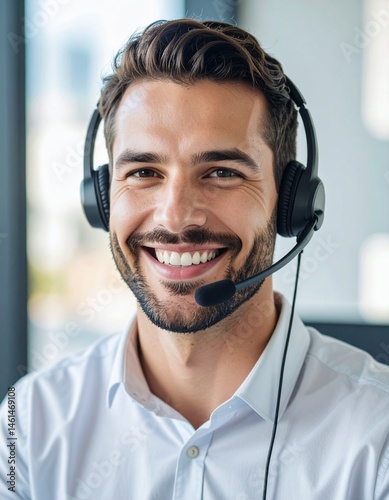 A vibrant and professional American customer care representative is seen smiling warmly while wearing a sleek headset in a modern office setting.