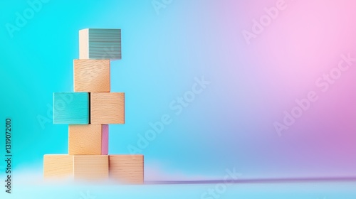 A vibrant arrangement of colorful blocks stacked against a softly blended turquoise and pink background, evoking creativity and playfulness.