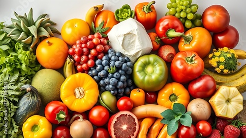 A vibrant arrangement of fresh fruits and vegetables, artfully composed under natural daylight.