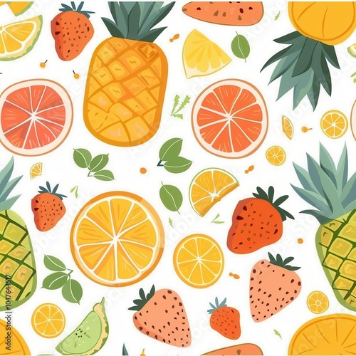 fruit, pattern, colourful, design, pineapple, strawberry, citrous, fruit, vibrant, illustration, fresh, decor, playful, print, summer, theme, tropical, style, bright, background, cheerful, art, element, textile, kitchen, nature, element, seasonal, yellow, orange, green, leaf, organic, shape, fun, artwork, wallpaper, inspiration, variety, food, summer, generative, ai