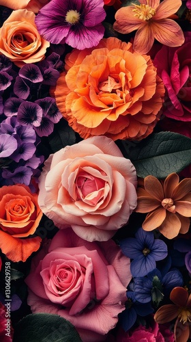 A vibrant array of flowers in various colors fills the frame, showcasing bright reds, yellows, blues, and purples, creating a lively and cheerful garden scene.