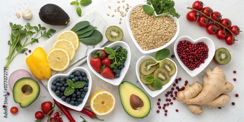 A vibrant array of healthful ingredients, showcasing a spectrum of colors and textures, arranged thoughtfully in heart-shaped bowls for a visually appealing and nutritious meal preparation.