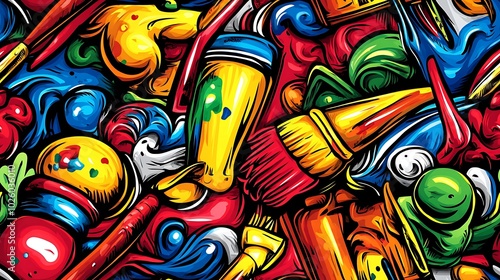 A vibrant artistic expression doodle pattern showcasing paintbrushes, paint splatters, palettes, and art easels, with swirling lines of color and paint strokes,