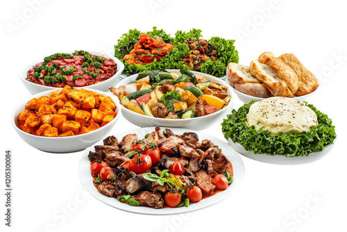 A vibrant assortment of delicious dishes arranged in bowls, featuring fresh vegetables, meats, and sides, showcasing a feast for any occasion.,Isolated on transparent background