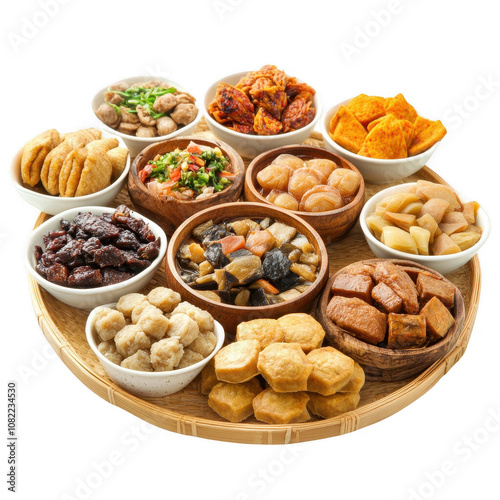 A vibrant assortment of delicious snacks served in bowls on a wooden platter., isolated on a transparent background.