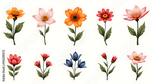 A vibrant assortment of floral illustrations featuring various flowers in diverse colors and shapes.