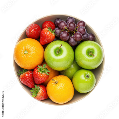 A vibrant assortment of fresh fruits in a bowl, showcasing oranges, apples, grapes, and strawberries, ideal for healthy eating concepts