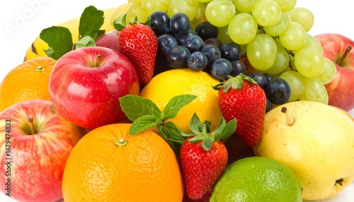 A vibrant assortment of fresh fruits, including apples, oranges, strawberries, grapes, and a pear, artfully arranged on a white background