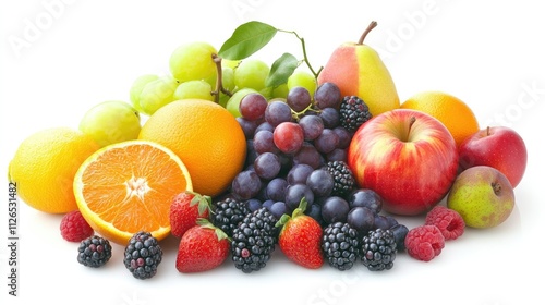 A vibrant assortment of fresh fruits including oranges, apples, and berries scattered on a clean white background. Bright and refreshing.