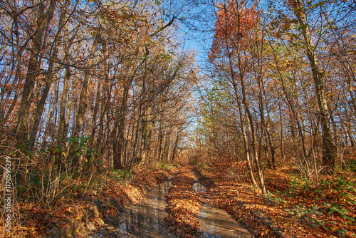autumn, forest, path, leaf, orange, gold, tree, foliage, fall, trail, nature, outdoors, seasonal, scenic, tranquil, peaceful, colourful, vibrant, beauty, rustic, sky, sunlight, shadow, branch, crisp, earthy, serene, picturesque, rural, wooded, environment, wilderness, wander, adventure, calm, quiet, hiking, exploration, wet, puddle, countryside, natural, landscape, seasonal change, scenic view, autumn forest
