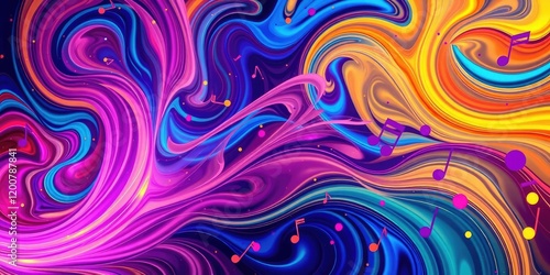 A vibrant background composed of swirling shapes and colors that resemble music notes creating a sense of movement and energy, guitar strings, harmony, arrangements