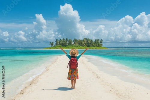 beach, traveler, sand, island, tropical, joy, nature, vibrant, colourful, ocean, turquoise, sky, cloud, adventure, freedom, serene, inviting, landscape, outdoors, paradise, sunshine, path, greenery, happiness, exploration, scenery, warm, relaxation, escape, scenic, beautiful, lifestyle, wanderlust, calmness, coast, environment, travel