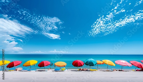A vibrant beach scene with colorful umbrellas and a clear blue sky.