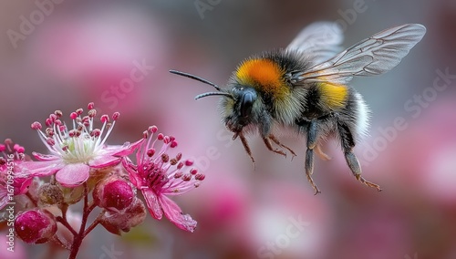 A vibrant bee in flight, hovering near a cluster of delicate pink flowers. The bee's fuzzy body is a mix of black, white, and orange, contrasting beautifully