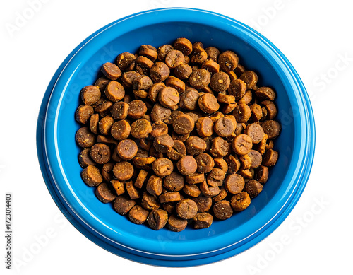 bowl, blue, kibble, food, pet, dog, cat, animal, round, brown, small, piece, overhead, view, top, dark, background, black, meal, nourishment, diet, dry, crunchy, tasty, delicious, healthy, complete, balanced, protein, grain, ingredient, eat, dinner, breakfast, dinner, dish, plastic, container, serving, portion, plentiful, abundant, ample, supply, domestic, companion