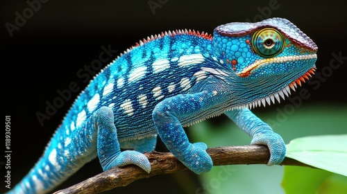 A vibrant blue chameleon perched on a branch, showcasing its colorful scales.
