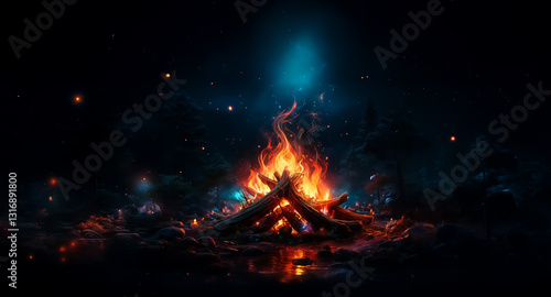 A vibrant bonfire blazes against a dark night backdrop, illuminating the surroundings with warm light and sparks. The flames dance and flicker, creating a peaceful and serene atmosphere.