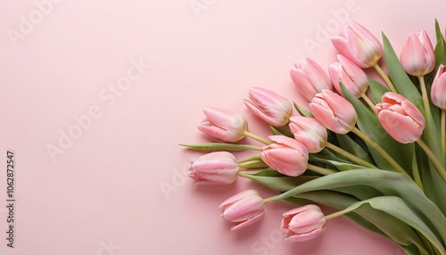 A vibrant bouquet of delicate pink tulips stands prominently on a soft, serene pink background, with a generous empty space, inviting the viewer to add their own text or design