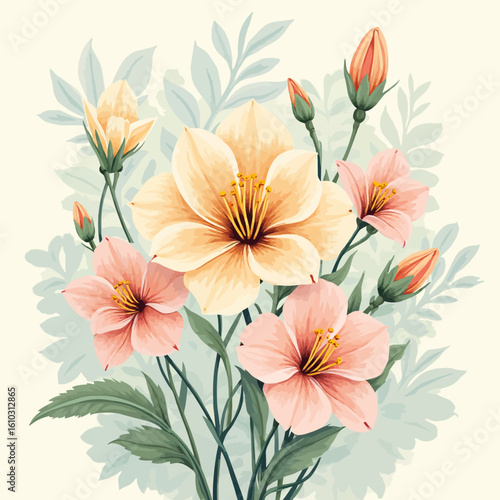 flower, bouquet, peach, cream, pastel, blossom, foliage, leaf, stem, bud, delicate, vibrant, nature, illustration, art, floral, design, spring, summer, botanical, colours, soft, light, pretty, gentle, artistic, decorative, pattern, high-coloured, arrangement, elegant, natural