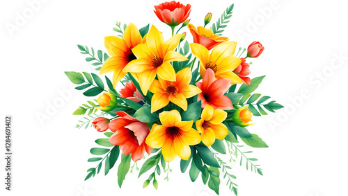 A vibrant bouquet of yellow and red flowers surrounded by green leaves.